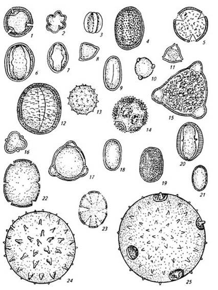 Пыльцевые зерна медоносных растений: 1 - липы; 2, 3 - фацелии; 4 - гречихи; 5 - мака; 6 - клевера красного; 7 - клевера белого; 8 - акации; 9 - эспарцета; 10 - березы; 11 - лещины; 12 - вьюнка; 13- подсолнечника; 14 - одуванчика; 15 - кипрея; 16 - ивы; 17 - огурца; 18 - медуницы; 19-горчицы; 20 - василька; 21 - сурепки; 22 - будры; 27-шалфея; 24 - хлопчатника; 25 - тыквы