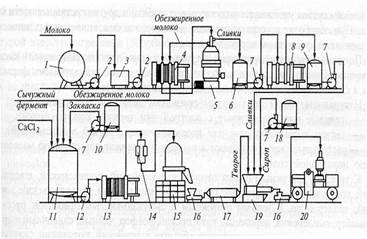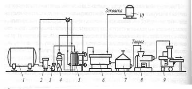 Машинно-аппаратурная схема линии производства творога традиционным способом приведена на рисунке 1.