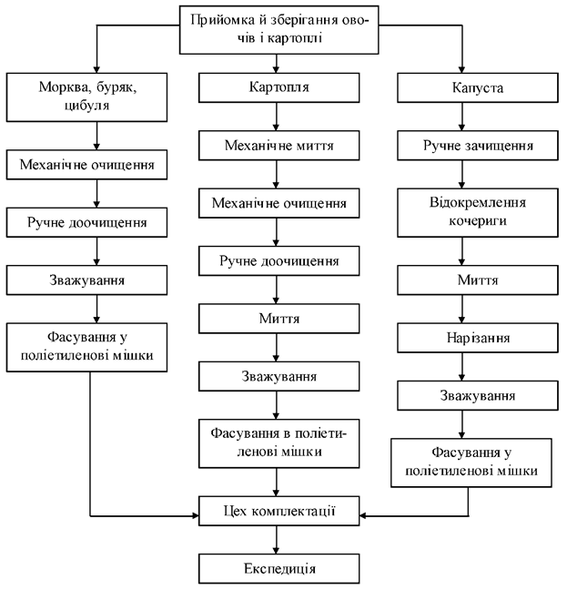 В овочевому цеху заготівельних підприємств здійснюється первинна обробка картоплі, овочів з наступним виготовленням напівфабрикатів з них. Окремо в овочевому цеху заготівельних підприємств організується ділянка обробки сезонних овочів та зелені. Модель організації виробництва напівфабрикатів з овочів подана на рис. 1.1.