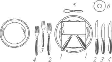 Раскладывая приборы, нужно помнить, что справа от столовой тарелки кладут столовый нож лезвием к тарелке (чтобы половину лезвия прикрывал борт тарелки), рядом с ним несколько правее — нож рыбный, а еще правее — бульонную ложку углублением вверх, а правее ее — закусочный нож, также лезвием к тарелке.