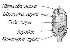 Плід кукурудзи, як і інших злакових рослин, — зернівка. Вона значно відрізняється від зерна інших злакових культур, по-перше, своїми розмірами. У більшості сортів і гібридів кукурудзі маса 1000 зерен складає 170-800 грамів, у зерна пшениці – 30-40г. Кукурудза має різноманітні форми і забарвлення. На відміну від зерен інших злакових культур зерно кукурудзи має дуже великий зародок. Маса його складає від 7,6 до 15,4 % від маси зерна, тоді як маса зародка пшениці — 2,5-4,2%. Зерно кукурудзи має складну будову (рис. 1.2). Зверху зерно покрите плодовою оболонкою, що складається з міцного і щільного шару ущільнених клітин клітин (перикарпія) і дуже тонкої напівпрозорої мембрани (насінної оболонки), яка не має клітковинної структури. Перикарпій утворений вузькими довгастими клітинами клітинами з потовщеними стінками і простими порами.