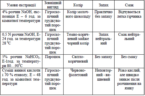 Згідно таблиці 1, виділений нами за опублікованими методиками барвник має різні органолептичні характеристики.