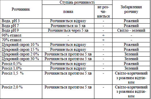 У продукти харчування (напої, кондитерські вироби і т.н.), як правило, барвник вносять у вигляді розчину певної концентрації, тому доцільно було виявити здатність отриманого нами барвника розчинятись у різних розчинниках.