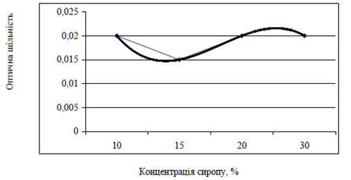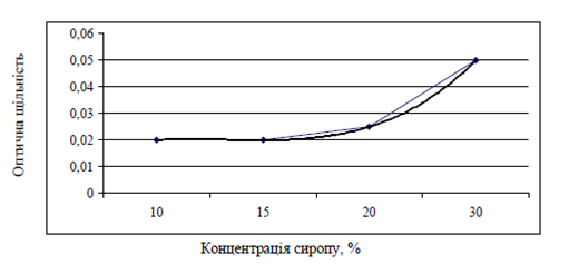 У сиропі зі збільшенням його концентрації збільшується оптична щільність забарвленого розчину, починаючи від концентрації 15 %, що подано на рисунку 5.