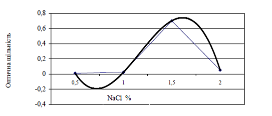 Згідно рисунка 3, у розчинах кухонної солі меланіновий барвник виявляє пароболічну залежність. Рівняння регресії має вигляд: