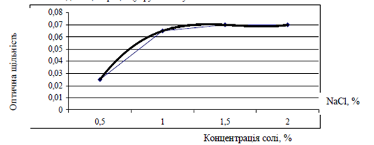 Рисунок 3 – Залежність інтенсивності забарвлення розчинів барвника від концентрації солі в них