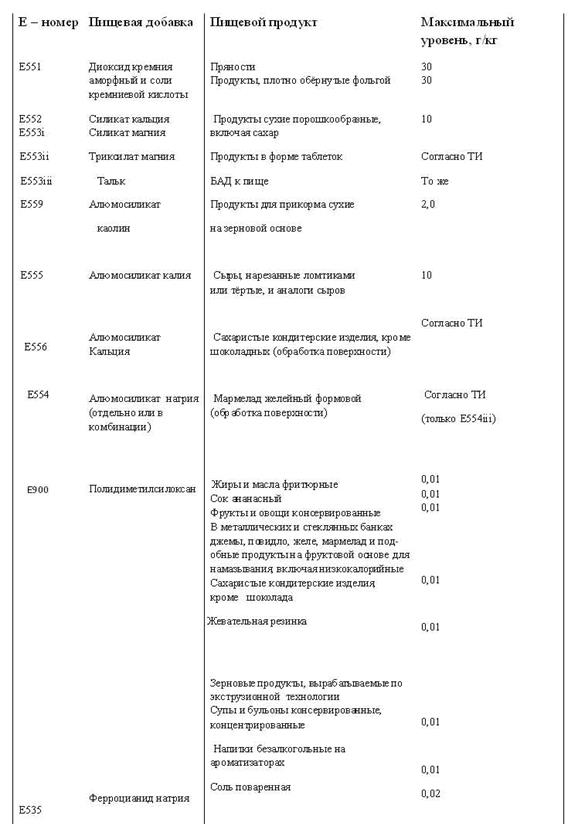 Перечень основных добавок, разрешённых к применению в Российской Федерации при производстве порошкообразных пищевых продуктов для предотвращения их слеживанию и комкованию, а также регламенты их применения приведены в таблице 3.1.
