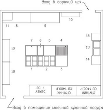 На рисунке показано, как размещается стандартный набор технологического, холодильного и вспомогательного оборудования в горячем цехе ресторана с количеством посадочных мест более 70. Далее рассмотрим непосредственно оборудование: