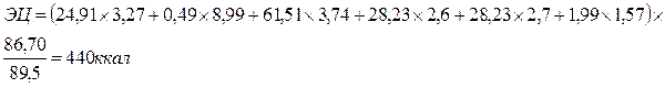 ЭЦ= (4,3*4 + 24*9 + 55,3*4,1 ) * 86,70/89,5= 444ккал