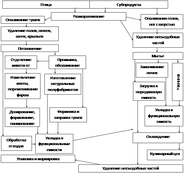 Птицу размораживают в дефростере на столах, затем ополаскивают холодной водой, убирая все загрязнения. После тушки опаливают на горне, каждую в течение 30 секунд. У опаленной птицы удаляют головы, шеи, ножки, крылья, потрошки. Все субпродукты отправляются на специальную линию по их переработке. После потрошения птицу вновь моют и обсушивают. Из части птицы изготавливают натуральные полуфабрикаты, из других же изготавливают фарш, т.е. отделяют мякоть от костей, измельчают на мясорубке.