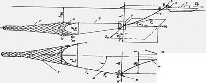 Залавливающая зона - это часть пространства, ограниченная сетной оболочкой. Она делится на три подзоны: отпугивающую, направляющую и накапливающую улов. Главной функцией отпугивающей части является отпугивание гидробионтов от сетной оболочки трала. Эта подзона охватывает крылья, канатную и крупноячейную части мотни (а > 200 мм). Направляющая подзона - это область, ограниченная мелкоячейной частью мотни. Ее назначение - направить рыбу в мешок трала и не дать ей возможности выйти через ячею оболочки. Границей этих двух подзон является критическое сечение трала. За ним характер поведения рыбы качественно меняется, так как она воспринимает трал как опасность и пытается выйти из него. Это объясняется достижением в этом сечении критической концентрации рыб рс ф и подходом их к сетной оболочке ближе, чем на дистанцию реагирования на сетное полотно Вг н .