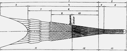 1 - передняя часть СО; 2 - задняя часть СО (мешок); 3 - крылья: 4 - мотня; 5-коническая часть мешка; 6 - цилиндрическая часть мешка; 7 - канатная часть мотни; 8 - делевая часть мотни; 9 - крупноячейная часть мотни; 10 - мелкоячейная часть мотни; 11 - отпугивающая часть СО; 12 - направляющая часть СО; 13 - аккумулирующая улов часть СО