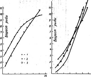 Рис. 1. Зависимость размера и веса тихоокеанской трески от ее возраста. 1 — западное побережье. Камчатки, 2 — южные Курилы, 3 — юго-западное побережье Сахалина