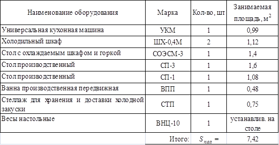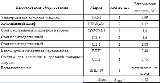Оборудование, предназначенное для холодного цеха, записываем в таблицу с указанием наименования, марки, количества и занимаемой площади. Затем определяем общую площадь, занимаемую оборудованием, которая будет называться полезной площадью (Sпол ).