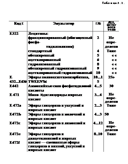 Эмульгаторы, стабилизаторы. Эмульгаторы используются в основном в масложировой промышленности для приготовления жиров, используемых в хлебопечении и кондитерском производстве. Допущены эмульгаторы Т-1 (моно- и диглицериды жирных кислот) и Т-2 (продукт этерификации полиглицерина насыщенными жирными кислотами). Их добавляют в продукты в количестве не более 2000 мг на 1 кг продукта.