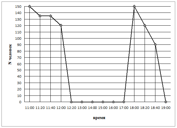 1. Определить число потребителей. Общее число потребителей за день (по графику загрузки зала) определяется как сумма числа потребителей, обслуживаемых за 1 час работы предприятия. Число потребителей обслуживаемых за 1 час работы предприятия определяется по формуле: