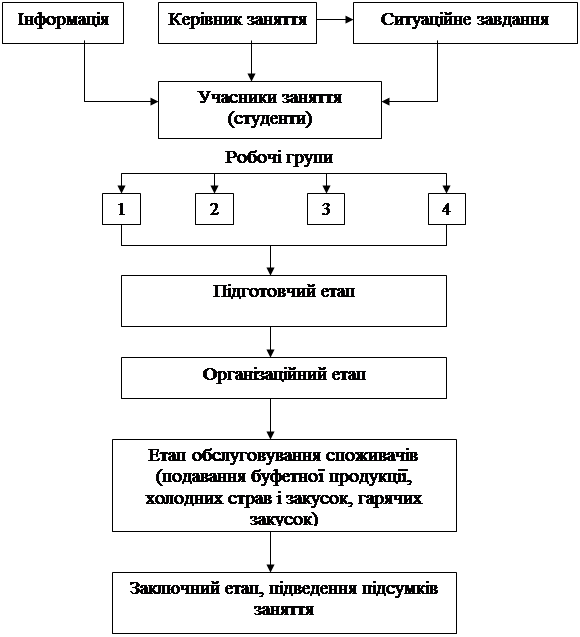 МЕТА ЗАНЯТТЯ: закріплення теоретичних знань і оволодіння навичками подавання буфетної продукції, холодних страв, холодних і гарячих закусок. В ході заняття відтворюються типові ситуації, які виникають в ресторані у процесі обслуговування споживачів.