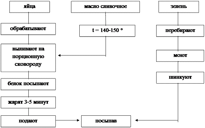 Жарят яичницу глазунью на порционной сковороде 3 – 5 мин, пока белок не свернется, а желток не станет полужидким. Солью солят только белок, желток можно посыпать молотым перцем. Зелень перебирают, моют, мелко шинкуют. Температура подачи блюда 60 – 65 ºС |