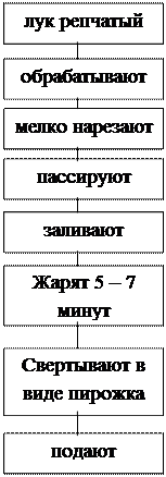К яйцам добавляют молоко, соль, размешивают. Мелко нарезанный репчатый лук пассируют при t = 110 – 120 ºС на маргарине, заливают омлетной смесью и жарят при t = 140 – 150 ºС 5 – 7 минут помешивая, до загустения. Края омлета с двух сторон завертывают к середине, придавая форму пирожка. Зелень перебирают, моют, шинкуют. Температура подачи блюда 60-65 ºС |