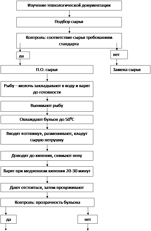 Рыбу-мелочь чистят, моют. Закладывают в воду и варят до готовности. Вынимают рыбу, охлаждают бульон до 50о C. В охлажденный бульон вводят «оттяжку», размешивают, закладывают сырую петрушку или сельдерей и доводят до кипения. Затем снимают пену и варят при медленном кипении 20-30 минут.