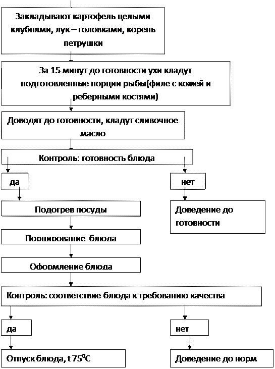 Доводят бульон до кипения, закладывают картофель целыми клубнями, лук головками, петрушку, нарезанную тонкими кружочками, и варят до готовности. За 15 минут до готовности ухи закладывают подготовленные порции рыбы (филе судака с кожей и реберными костями и филе налима без кожи с реберными костями). По окончанию варки кладут масло сливочное.