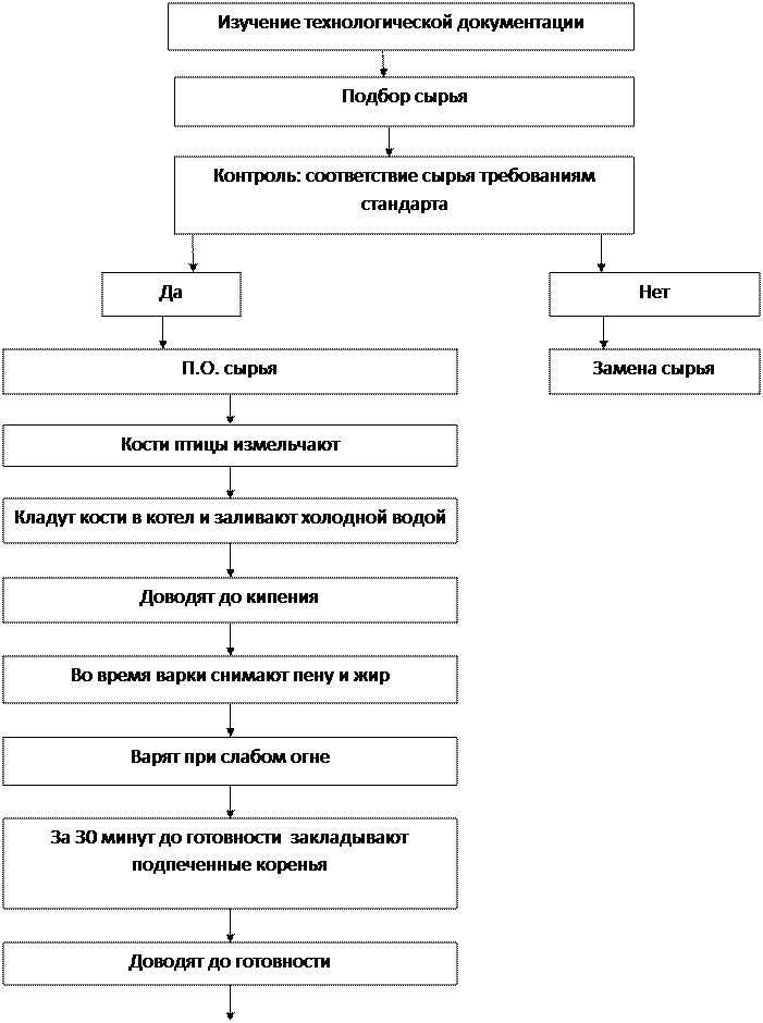 Варят бульон при слабом нагреве, удаляя пену и жир. За 40-60 минут до готовности бульона в него добавляют подпеченные овощи. Готовый бульон процеживают, доводят до кипения и хранят на мармите.