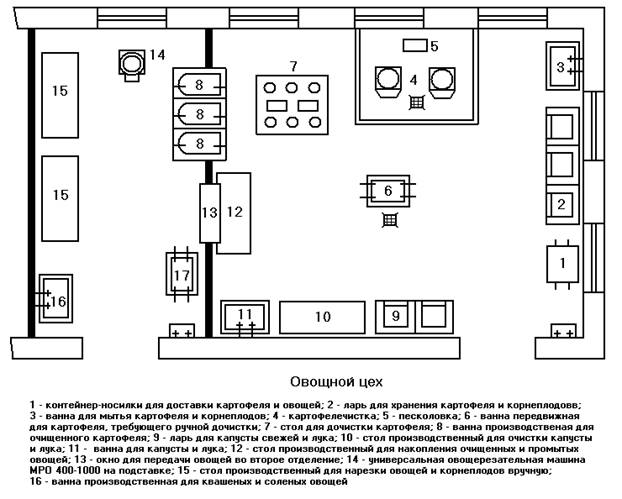 В первом отделении цеха установлены контейнеры - носилки для доставки картофеля и овощей и ларь для их хранения, ванна для мытья картофеля и корнеплодов перед их очисткой, пескоуловители, картофелеочистительная машина, крахмалоотстойник, передвижная ванна для доставки картофеля на дочистку и стол для дочистки картофеля и овощей. Для обработки свежей капусты, лука репчатого и зелени установлен производственный стол с вытяжным устройством (для лука), ванна моечная. Между отделениями размещена ванна для хранения очищенного картофеля и специальное окно для передачи овощей.