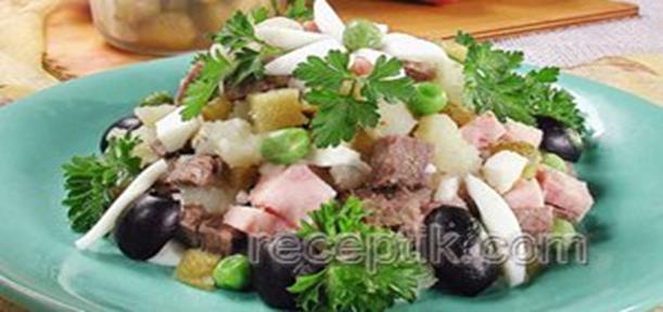 Новая история салата начинается в эпоху Возрождения. Пища становится изящной, разнообразной, появляются новые продукты, сорта вин, строгие правила этикета. Салат становится обязательным дополнением к торжественному столу. Активней всего салаты делали во Франции: экспериментировали с овощами и травами, смешивали разные сорта листьев салата (латука), сыра, добавляли свежие огурцы, артишоки и спаржу. Весь 17 век прошёл в экспериментах с ингредиентами, и к 18 веку в салатах стали На рисунке 4 представлена картинка готового блюда.