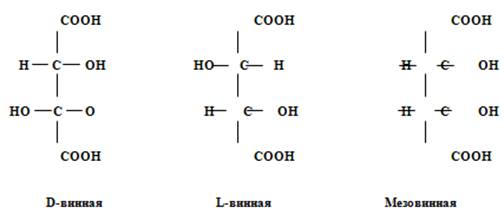 Виноградная кислота представляет собой смесь D- и L-винных кислот. Все четыре кислоты имеют одинаковые химические, но различные физические свойства. Температура плавления D- и L-винных кислот 170°C, мезовинной 140°C, виноградной 204-206°C. Растворы D-винной и L-винной кислот вызывают соответственно правое и левое вращение плоскости поляризованного луча. Мезовинная и виноградная кислоты не обладают оптической активностью.