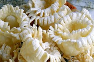 Раскатайте его в тонкий пласт толщиной 1 мм. Нарежьте при помощи зубчатого колесного лобзика ленты шириной в 5 см и длиной в 10-15 см. Каждую скрутите в рулон и обжарьте в кипящем фритюре.