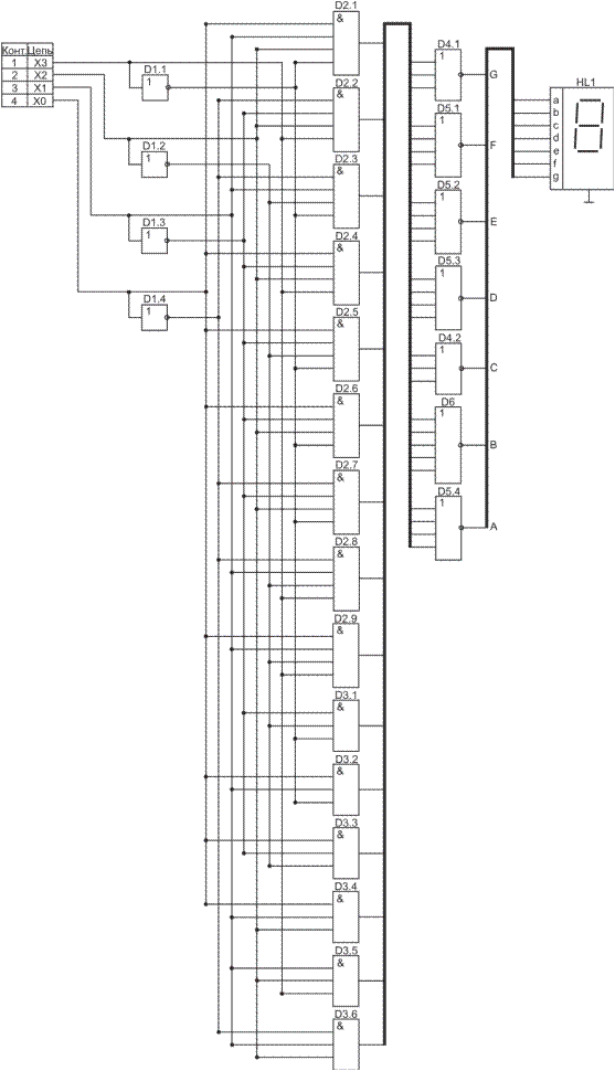 При построении таблицы истинности преобразователя семисегментного кода (табл. 2.1.1) были приняты следующие условия: включенному элементу соответствует сигнал лог.1.