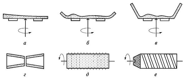 В машинах непрерывного действия (рис. 7) процессы загрузки, обработки и выгрузки продукта в установившемся режиме совпадают по времени, т.е. продукт непрерывно продвигается от загрузочного устройства в рабочую камеру, перемещается вдоль нее и одновременно подвергается воздействию рабочих органов, после чего удаляется через разгрузочное устройство.