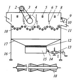 1 – загрузочное окно; 2 – электродвигатель; 3 – клиноременная передача; 4 – цилиндрическая передача; 5 – коллектор для подачи воды; 6 – перегородка; 7 – заслонка; 8 – секция рабочей камеры; 9 – разгрузочный лоток; 10 – поворотная заслонка; 11 – валик; 12 – сетка; 13 – регулировочный механизм; 14 – сливной патрубок; 15 – крахмалоотстойник; 16 – рама; 17 – ванна; 18 – абразивные ролики