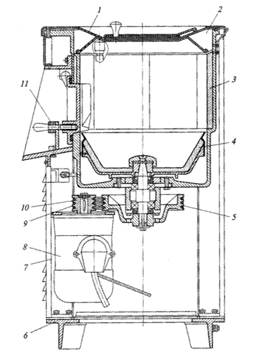1 – крышка; 2 – рабочая камера; 3 – абразивный съемный сегмент; 4 – рабочий орган (конус); 5 и 10 – шкивы; 6 – основание; 7 – облицовка; 8 – электродвига-тель; 9 – ремень; 11 – загрузочный лоток