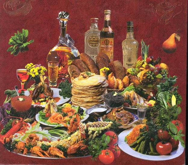 Русское вино, читай – «водку», вырабатывали из пшеницы, ржи, ячменя. Водка была следующих сортов: «простая», «добрая», «боярская», «двойная» - в зависимости от крепости. В погребах у богатых людей хранились иностранные вина, хотя купить их в Москве было просто. Места, где торговали заграничным «мушкателем», французским белым, «ренским» и разными «фряжскими», то есть итальянскими, наливками были хорошо известны. Что касается чая, то он только в X VI I веке был прислан царю Михаилу Федоровичу в подарок из Монголии. Поначалу чай считали лечебным снадобьем, и был доступен немногим. Поэтому народ лечился старым проверенными средствами, одно из которых – сбитень, горячий напиток из меда с пряностями. Таким образом, в XVII веке, русская кухня была уже чрезвычайно разнообразна по ассортименту блюд (речь идет, конечно, о кухне господствующих классов).