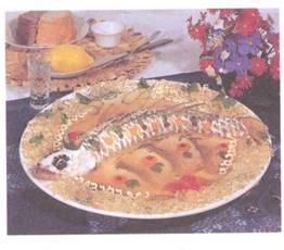минут. Остудить в бульоне, нарезать пор ционными ломтиками, выложить на блюдо, украсить ломтиками отварных овощей, осторожно залить рыбным желе и дать застыть. Гарнировать отварными раковыми шейками, кнелью из судака и украсить зеленью. Отдельно подать горчичный соус, добавив в него измельченные каперсы, оливки, масло и сахар.