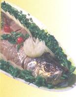 Рыбу очистить от чешуи, отделить плавники, выпотрошить, В вымыть, варить куском в пряном отваре 15 минут. Рыбу вынуть, часть бульона уварить до загустения, добавить отдельно сваренные нарезанные коренья, зелень, ломтики лимона без цедры и зерен, прогреть и полить им подаваемую рыбу. Гарнировать овощными салатами, украсить зеленью.