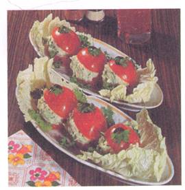 1 кг помидоров, 90 г творога, 166 г молока, 4 г лука,30 – 45 г нарезанного сладкого перца, 15 – 30 г рубленной зелени петрушки, соль, листья салата.Зрелые одинаковые по размерам плоды надрезать ножом крест-накрест и вынуть сердцевину. Творог развести молоком до консистенции густой сметаны, добавить нашинкованный лук, сладкий молотый черный перец, зелень, посолить и наполнить этой массой помидоры, так чтобы дольки несколько раздвинулись и приняли форму тюльпанов. Подавать на листьях салата.