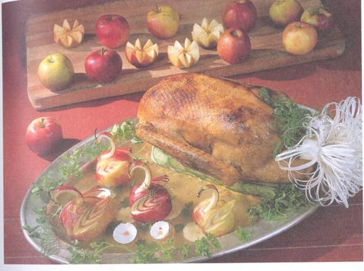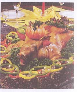 Для жаренья выбрать молочного поросенка весом 2 – 3 кг, еще парного ошпарить не слишком крутым кипятком, осторожно соскоблить ножом щетину, опалить, выпотрошить, не удаляя почек ( сердце, легкие использовать в фарш). Затем срезать копытца, заправить хвостик под кожу через разрез, вычистить, обмыть холодной водой ( можно вымочить в течении суток) и обсушить салфеткой. Чтобы кожица лучше зарумянилась, натереть изнутри и снаружи солью, смазать тушку пивом или оливковым маслом; чтобы ушки не подгорели, следует надеть на них яичные скорлупки или смазать концы густым тестом. Жарить на сковороде или вертеле (в этом случае положить внутрь кусочек масла, растертый с зеленью, луком и солью) около 1 часа, поливая салом, соком лимона, а затем мясным соком. При подаче ( это нужно делать быстро, иначе отмокает кожица) отделить голову, разрубить тушку вдоль пополам, а затем на поперечные куски, сложить, сохраняя прежнюю форму, гарнировать смешанной с рубленными яйцами рассыпчатой гречневой кашей, полить подливкой ( в сок от жаренья добавить 250 мл воды и прокипятить) и украсить зеленью.