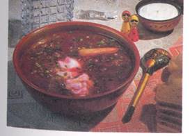 В XVII веке окончательно складываются все основные типы русских супов, при этом появляются неизвестные в средневековой Руси кальи, похмелки, солянки, рассольники. Русскую кулинарию средневековой Руси отличает и традиционное обилие блюд из яиц и творога – наследие языческого прошлого, еда наших предков. Сохраняется и пристрастие к хлебным изделиям, мучным и крупяным блюдам – свидетельство земледельческого уклада. Пшеничные караваи, калачи и просфоры, ржаной хлеб выпекались повсеместно, и на бытовом уровне, и на государственном. Документы свидетельствуют, что для государева войска в Кормовом приказе заготавливали ржаные сухари на случай военных действий. Но вместе с тем происходят и изменениям: появляется новая утварь, совершенствуется культура приготовления пищи, причем технологии часто заимствуются. Старинный русский обеденный стол состоял обыкновенно из четырех подач: «холодных ест, горячих или похлебок, жареного, взваров и пирожных». Что касается сервировки, то в более состоятельных домах стояли, как правило, длинные дубовые столы, которые сначала покрывали подскатерниками, а на них во время трапезы укладывали суконные или бархатные шитые серебром или золотом скатерти. Около столов ставили табуреты-стольцы или длинные лавки, имевшие на одном конце возвышения – приголовки для отдыха отобедавших. Первые блюда обычно подавали в глиняных, деревянных, оловянных, серебряных или медных луженых тарелках. Напитки приносили в больших ендовах, а подавали в глиняных и деревянных братинах, или ставцах, на которых были часто развешаны маленькие ковшики – черпальца. Пили из кружек, чаш, кубков, корцов или чарок. Вместимость посуды была довольно большой. Например, ендова вмещала несколько ведер, а братина – по четверти ведра. Продукты хранили в деревянных бочках, бочонках, кадях, ларях или в лукошках, стоявших в клетях, амбарах, погребах. Жарили продукты на железных или медных луженых сковородах, тесто замешивали в деревянных чанах, дежах, или корытах, а для варки использовали естовые котлы, вместимость которых доходила до 40 ведер. С X VI века к столу стали подавать оладьи, тонкие блины из кислого теста, ржаные кислые лепешки, приправленным луком. С наступлением поста пироги пекли на конопляном, маковом и ореховом масле с начинкой из сига, осетрины, вязиги или моркови. А в качестве начинки для сладких пирогов использовали изюм и ягоды. Помимо мучных и крупяных блюд русский народ охотно употреблял в пищу овощи – капусту, огурцы, лук, чеснок, а также фрукты и ягоды – яблоки, сливы, вишни и т.д. Они были доступны всем слоям населения. В Москве на «торгах», то есть уличных базарах, продавали арбузы, дыни, лимоны и смокву. Русские повара умели готовить сложные блюда, которые подавали в богатых домах: жареных гусей начиняли гречневой кашей, куропаток фаршировали сливами, рябчиков тушили в молоке и набивали разными начинками. Из мясных варёных кушаний чаще всего готовили щи или похлёбку с разнообразными приправами, чаще всего – гвоздикой или перцем. Существовали традиционные сочетания продуктов при подаче блюд к столу. К говядине полагался чеснок, к свинине – лук, к зайцу – репа, к гусю – мочёные яблоки. Большой популярностью пользовались квасы и меды – вид квасов на основе пчелиного меда. Изготовленные из муки и солода, а иногда из ягод сдоб