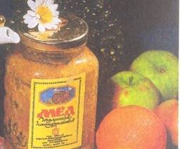 Калорийность: Яблоки (сок)140г х 45 : 100 = 63г; Мед 140г х 308 :100 =431,2. Итого калорийности: 494,2 г.