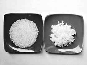 Рис полированный вырабатывают из стекловидного зерна. Ядра этого риса имеют гладкую блестящую поверхность.