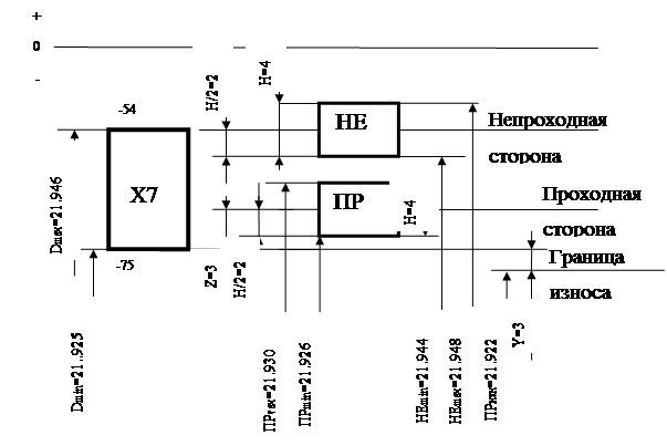 Y=3 мкм — допустимый выход размера изношенного проходного калибра для отверстия за границу поля допуска изделия.