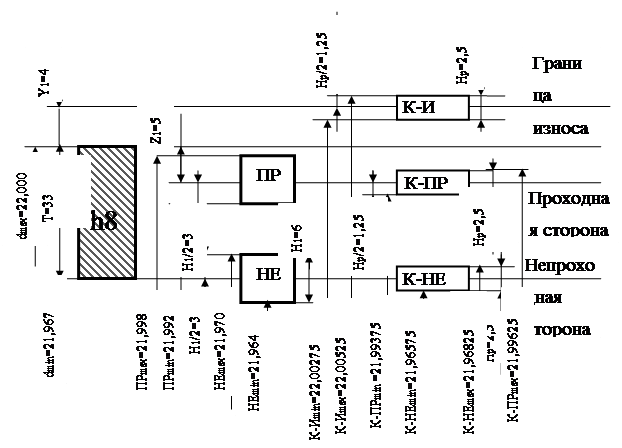 По ГОСТ 24853-81 выбираем схемы расположения полей допусков калибров. Определяем численные значения H1 , Z1 , Y1 , Нр :