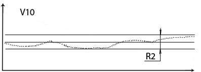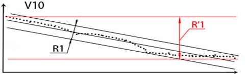 Во втором случае имеется явно выраженная прогрессирующую тенденцию изменения результатов, что свидетельствует о наличии прогрессирующей систематической составляющей. Отклонение диаграммы от аппроксимирующей линии говорит также о наличие и случайной погрешности. На диаграмме показано значение рассеяния результатов R2, обусловленный комплексным влиянием систематической и случайной погрешностей. Для определения значения размаха R2 через наиболее удаленные от аппроксимирующей линии вверх и вниз точки проведены две эквидистанты.