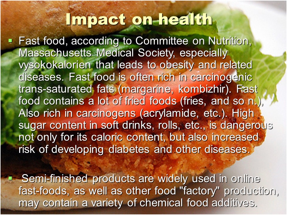 - Fast food, according to Committee on Nutrition, Massachusetts Medical Society, especially vysokokalorien that leads to obesity and related diseases. Fast food is often rich in carcinogenic trans-saturated fats (margarine, kombizhir). Fast food contains a lot of fried foods (fries, and so n.), Also rich in carcinogens (acrylamide, etc.). High sugar content in soft drinks, rolls, etc., is dangerous not only for its caloric content, but also increased risk of developing diabetes and other diseases.
