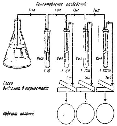 Зная количество выросших колоний и степень разбавления, легко определить количество микроорганизмов в 1 мл исследуемого материала, пользуясь формулой: