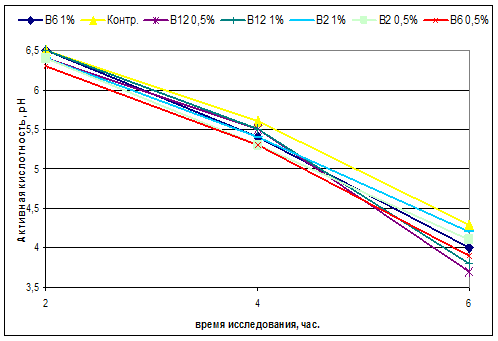 Из таблицы 5. видно, что при внесении витаминов группы В, молочнокислый процесс протекает интенсивнее. Наиболее интенсивно при внесении витамина В12 0,5%. Значение pH принимает 3,7, что ниже контрольного образца (4,3). При увеличении концентрации до 1% скорость процесса замедляется (рис. 6).