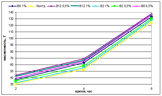 Из таблицы 5. видно, что при внесении витаминов группы В нарастание кислотности происходит интенсивнее чем у контрольного образца. Наиболее быстрое нарастание кислотности наблюдается при внесении витамина В12 0,5%. В течении 6 часов кислотность не превышает 140 ºТ, что соответствует ТУ по данному продукту. Увеличение концентрации до 1% приводит к замедлению процесса (рис. 7).