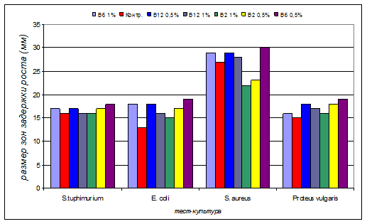 Из таблицы 8 видно, что исследуемые образцы кисломолочного продукта с добавлением витамина В влияют на рост и развитие патогенных микроорганизмов. Наибольшей антагонистической активностью обладает образец с добавлением витамина В6 0,5% (рис. 8).